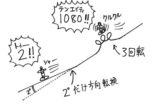 第24回オリンピック冬季競技大会(2022北京冬季五輪)、盛り上がっています。 さて、スノーボードのハーフパイプ等で、ジャンプしているあいだにグルングルン回転する技の名前を、回転角度の数字で表現します。3回転なら、360°×3=1080°なので「テンエイテ…
